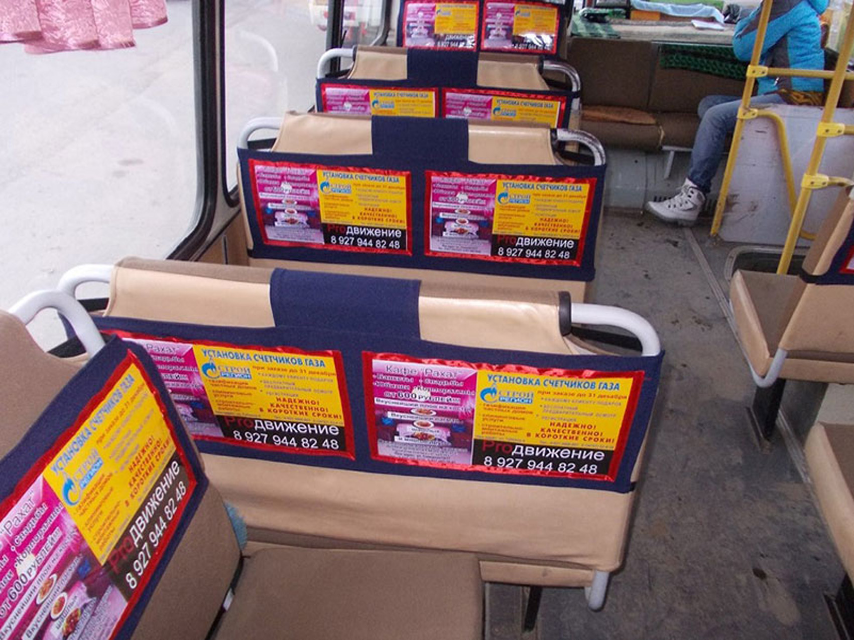 Реклама на подголовниках в транспорте на фото выше