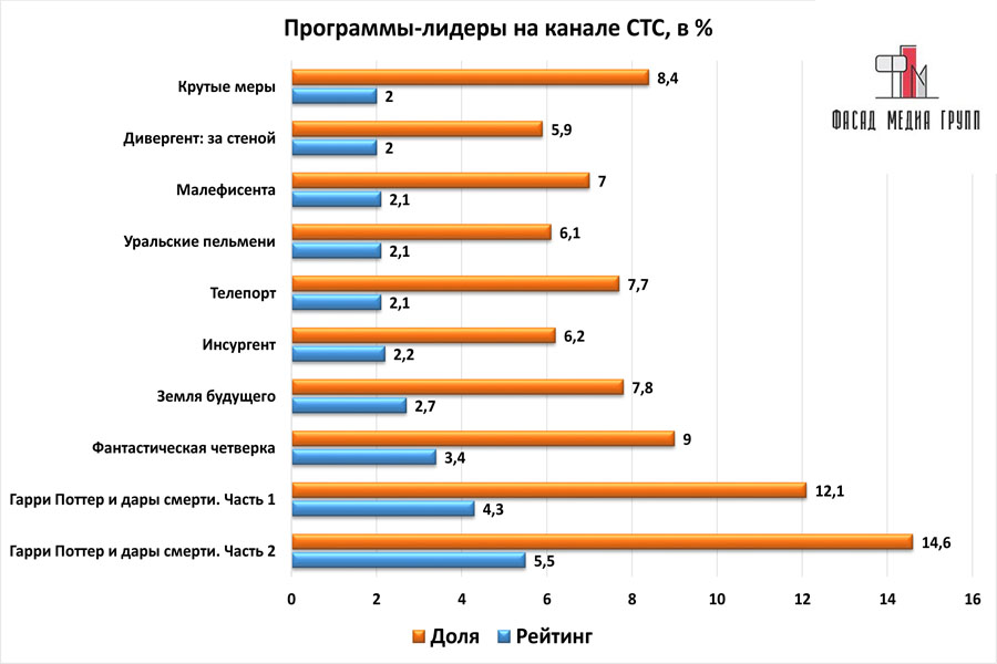 Популярность телеэфира на «СТС» приводит к ежегодному увеличению спроса на рекламное время. Для привлечения клиентов из разных регионов России, увеличения процента продаж, повышения имиджа компании и узнаваемости бренда – размещайте рекламу на «СТС». «СТС» – это проверенный и востребованный канал для размещения рекламы на костромском ТВ. Для размещения рекламы на телевидении обращайтесь в рекламное агентство «Фасад Медиа Групп». Будем рады сотрудничеству.